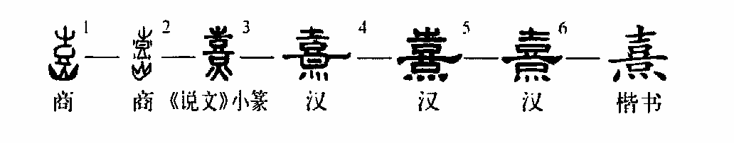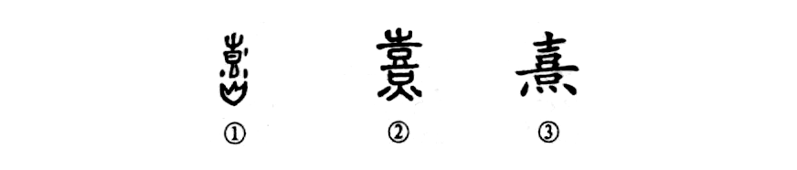 這個(gè)“熹”字是會(huì)意兼形聲的字。①是甲骨文的形體,上部為“鼓”形,下部是“火”,上古制好鼓之后,要用微火烤干其蒙皮,所以“熹”為“烤”義。②是小篆的形體,字形較繁,但意思未變。③是楷書的寫法。