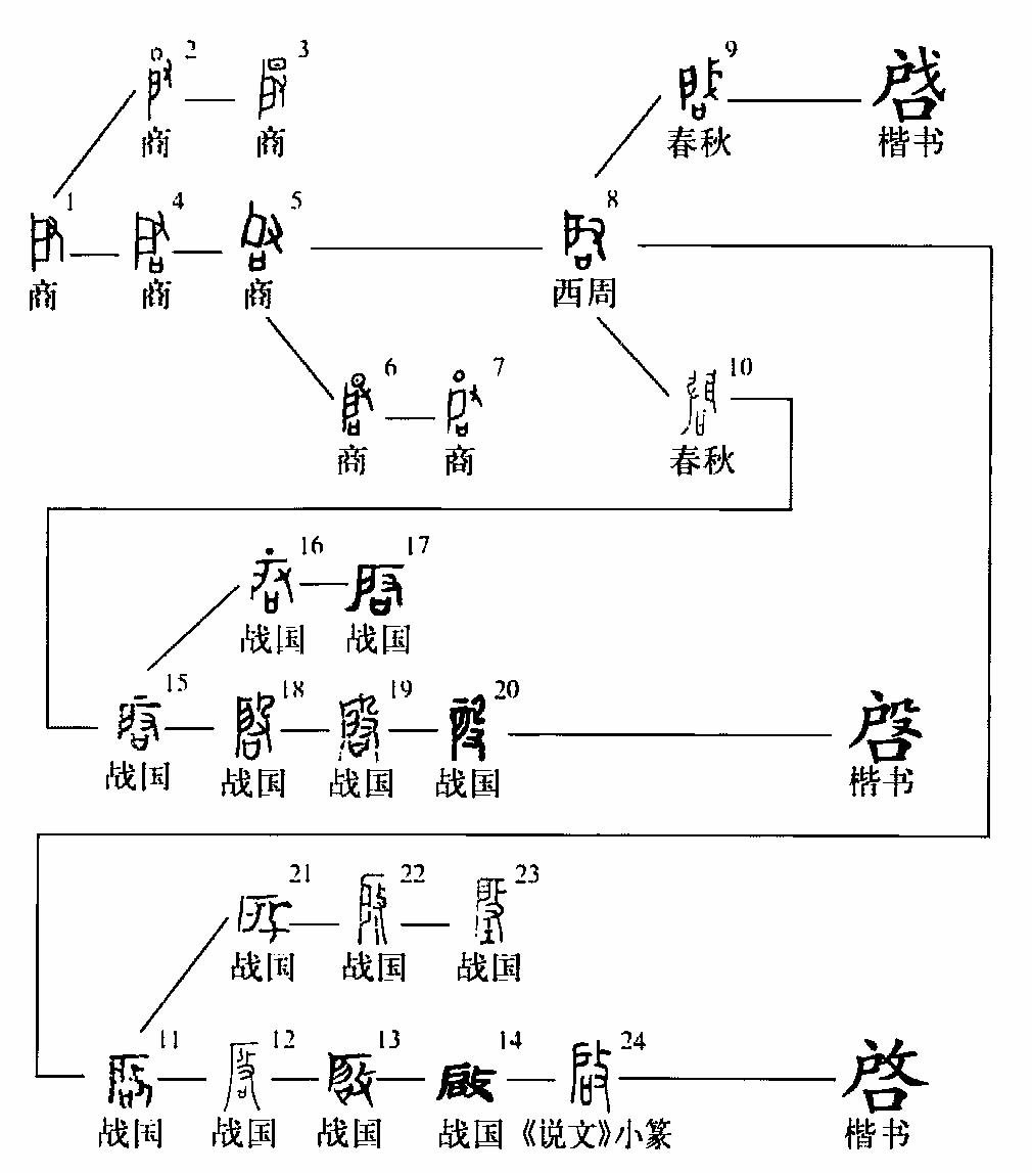 。構件“又”或作“戈”,以戈啟門,雖行用不久,楷書卻出現(xiàn)了啔字。當時另一主要變化是構件攴代替了又(屬于形義皆近構件的互用),后來一直成為啟字的主流寫法。到戰(zhàn)國時,構件“攴”又有作“殳”者(亦屬于形義皆近構件的互用),此寫法歷經(jīng)漢代,最終楷書又出現(xiàn)異體??。其時亦有省略口作??者,或易“口”為“土”作“