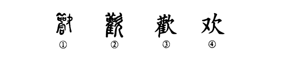 這是“歡天喜地"的“歡”字,本為形聲字。①是戰(zhàn)國璽印文的形體,左邊是“雚”字,表讀音,右邊是一個(gè)面朝左而站立的人,張口歡笑之形。②是小篆的寫法,與璽印文相似。③是楷書繁體字。④是簡化字。