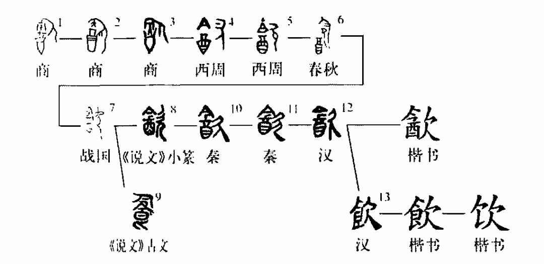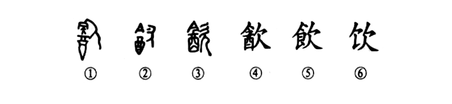 會意字。從酓從欠會意,“欠”像張口飲流食之形。董作賓《殷歷譜》:“酓,即?字,第一期作‘’,象人俯首吐舌,捧尊就飲之形,?其本字,酓其省變也。”甲骨文?字本為會意字,到了西周金文?字所從之舌形已訛變為從“今”,并與“人”形分離,“人”形也因“舌”形變為“今”形而變為從張口形的欠形。從西周早期金文開始?字就已省為酓形,省去了“欠”形,而且酓字習見于西周金文、春秋戰國金文。但在?字形體結構中酓仍然不是聲符,“酓”字為從酉今聲,西周金文及以后的各類出土文字中的?字形體結構可分析為從欠從酉(酒尊)會意,會飲酒(或其他流食)之意,今聲。飲字在文獻中最早見于《釋名》。清王筠《說文句讀》:“(?)隸作飲,參合篆古以成文也。《釋名》:‘飮,奄也,以口奄而引咽之也。’所飲之物亦曰飲。”飲字形體到目前為止最早見于戰國初年的金文,習見于戰國古璽文和漢隸,是戰國東方之國文字的寫法,是戰國時代產生的?字的又一異體字。《說文》小篆?字之古文形體??,就由戰國古文飲字形體訛變而來。今天?、酓等皆廢而不用,只通行飲(飲)字。(周寶宏)