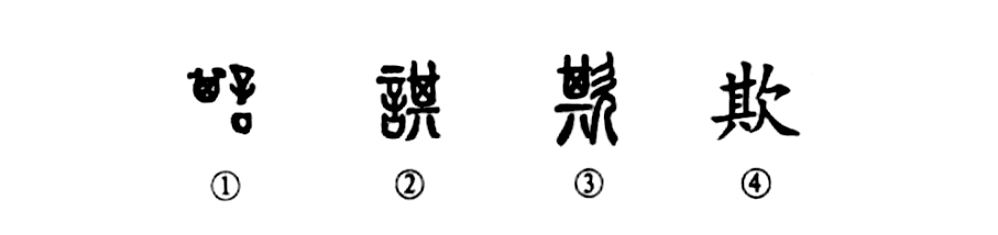 “貪財冒賄,欺罔視聽。”這個“欺”字本為形聲字。①是金文的形體。左邊為“其'表聲;右邊是“言”,表形。②是小篆的形體。③是小篆的異體字。“言”與“人”有關,“欠”本為“人”形,所以小篆即以“欠”代替了金文中的“言”,其義未變。本為以言騙人,后又以人行騙。④是楷書的寫法。