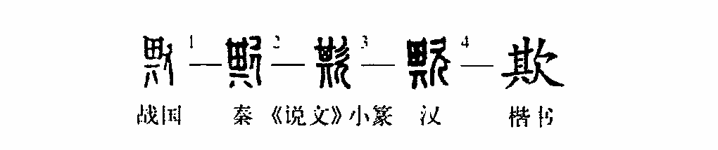 形聲字。《說文》:“欺,詐欺也。從欠,其聲。”嚴可均說文校議:“《韻會》引作:詐也。”段玉裁注從之刪“欺”字:“言部曰:詐者,欺也。從欠猶從言之義。”張舜徽約注:“言部:‘諆,欺也。’此蓋詐欺本字,與詐從言同意。欺從欠,則與虧部虧訓氣損義近。今俗稱所為欺人之事為虧心事,謂于內心有所損也,欺、虧雙聲,語之轉耳。”戰國文獻習見欺字用為欺詐、欺騙之義。諆、欺聲符相同,意符相近,故通用無別。張舜徽推測欺字之本義與虧(氣損)義相近,只可備一說而已。(周寶宏)