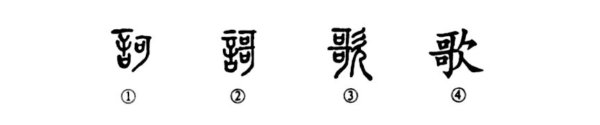“流風入座飄歌扇,瀑布侵階濺舞衣。”這個“歌”字本為形聲字。①是金文的形體,左邊是“言”,右邊是“可”,是“從言,可聲”的形聲字。②是小篆的異體字。③是小篆的通行體。將“言”換成“欠”,義相近,都與“人”有關。④為楷書的形體。
