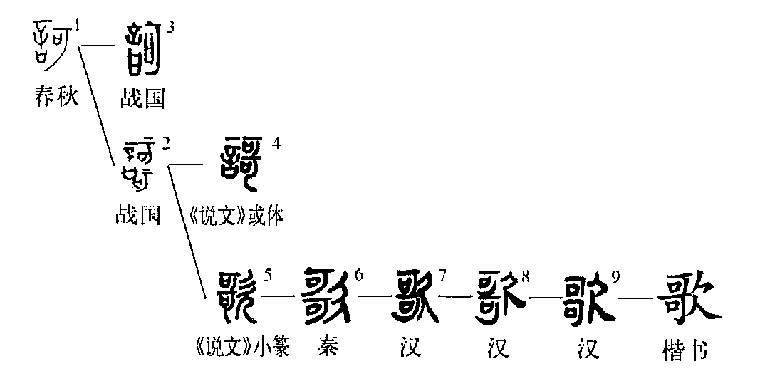 形聲字。 《說文》:“歌,也。從欠,哥聲。謌,謌或從言。”段玉裁注:“可部曰:哥,聲也,古文以為謌字。”《詩·魏風·園有桃》:“心之憂矣,我歌且謠。”毛傳:“曲合樂曰歌,徒歌曰謠。”《大雅·行葦》:“或歌或咢。”《小雅·四牡》:“是用作歌,將母來諗。” 《大雅·桑柔》:“既作爾歌。”歌字常見于西周文獻,但古文字資料中最早見于春秋時代。戰國古文字中歌字有從口哥聲者,也有從言可聲者,《說文》小篆之或體從言哥聲即承襲戰國古文字訶字的形體。從欠之歌,見于《說文》小篆,更習見于秦簡、漢簡帛,其形體當產生于春秋戰國時代的秦國。春秋時代的“訶”正用為歌曲之歌。(周寶宏)