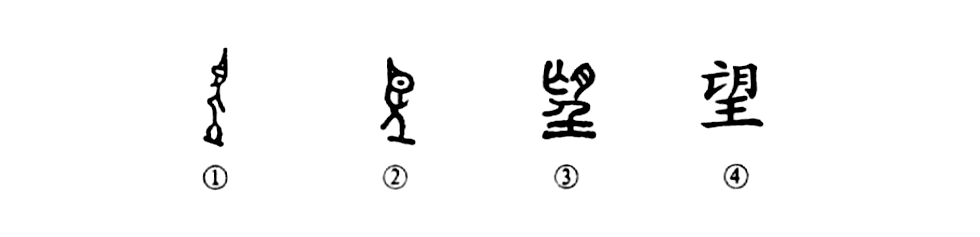 這是“登高而遠望”的“望”字,本為會意字。①是甲骨文的形體,上部是一只大眼睛,下部是一個人面朝左站在一個土堆上,表示登高而遠望。②是金文的形體,與甲骨文相似。③是小篆的形體,左上角增加了表聲的“亡”,右上角為“月”,下部仍為“人”形,表示望月之意。④為楷書的寫法。