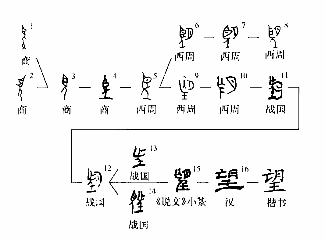 甲骨文“望”字有二種形體,一種形體像人舉目之形,一種形體像人站在土堆上遠望之形。金文承襲甲骨文,或加“月”,像人佇立望月之形。所從的“目”或訛變?yōu)椤岸保蜃冃我艋癁椤巴觥甭暋?zhàn)國文字承襲金文,或贅加“視”字繁化;或省“月”,從人、亡聲,所從“人”旁豎筆上加短橫作為飾筆,與“壬”同。《說文》遂誤認為從“壬”,又將“望”字分化為二字:望、朢,說形、解義均誤。今“望”行而“朢”廢矣。本義是向高處、遠處看。《玉篇·亡部》:“望,遠視也。”《詩·衛(wèi)風(fēng)·河廣》:“誰謂宋遠,跂予望之。” (誰說宋國遙遠,我踮起腳尖就看得見)金文“望”多為月相名。師虎簋: “隹(唯)元年六月既望甲戌。” 《釋名·釋天》:“望,月滿之名也。月大十六,小十五日,日在東,月在西,遙相望也。”通“忘”。縣妃簋:“孫孫子子毋敢望(忘)白(伯)休。”(徐在國)