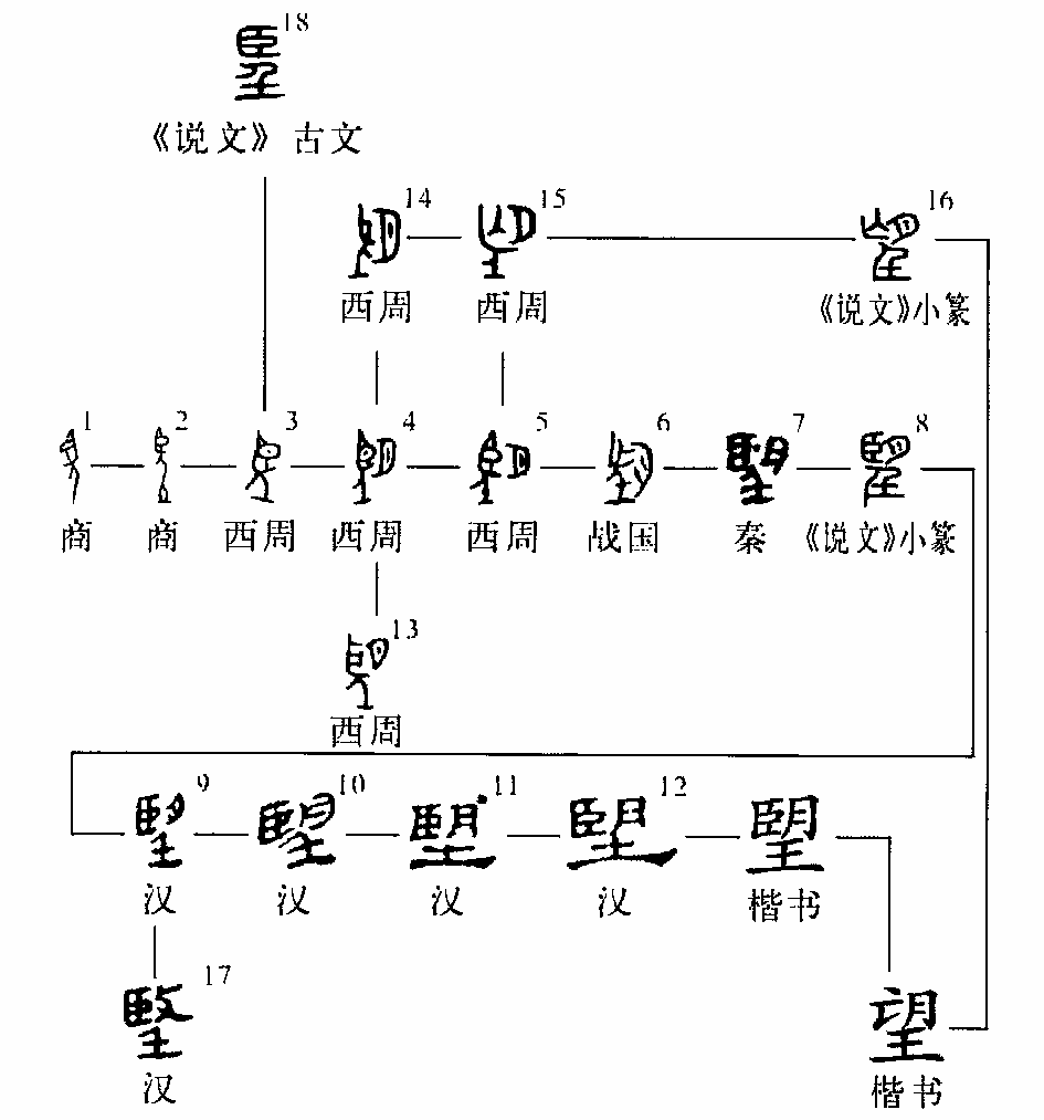 初文像一人站立地上張大其目或向前方或向后方遠望之形。到了西周,語言中有了朔朢之“朢”一詞。遂假其為聲,以月為意符,造為“朢”字以表之,同時也用以兼表張望、遠望之望。后來“朢”的形體中像目的部分出現(xiàn)一種訛近“亡”的寫法,如字形14,便干脆將這部分寫作“亡”,如字形15,以之提示字的讀音,因而又有了“望”字,成為“朢”的異體。再到后來,人們又采用異體字分工方式,以“望”字專門表示張望、瞭望、遠望之望。而以“朢”字專門表示朔朢之朢。《說文》:“朢,月滿與日相朢。”所釋即是“朢”的本義。漢字簡化,朔朢之朢、張朢、遠朢、瞭朢之朢統(tǒng)一作“望”。(董蓮池)
