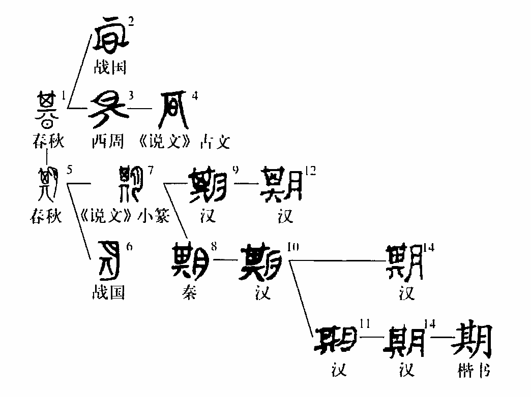 “不期修古,不法常可。”這個“期”字本為形聲字。①是金文的形體。其上部為“其”,表聲;其下部為“日”,表形。這說明“期”字與時間(日)有關,所以從“日”。②是小篆的形體。“其”字未變,將“日”換成了“月”,因為“日”與“月”均能表時間,可以互換。③是楷書的寫法。