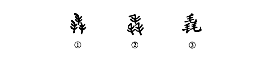 三毛為“毳”(cuì脆)。金文①和小篆②都是三毛形。楷書③是從小篆形體變來的,結構基本相同。三毛堆在一起也就表示細毛很多的意思,可見這個“毳”字是個會意字。