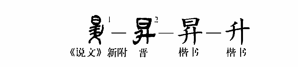 形聲字。《說文》所無,為徐鉉所增新附字。大徐本《說文》云:“昇,日上也。從日,升聲。古只用升。” 《廣韻》:“昇,日上,本亦作升。《詩》曰:如日之升。升,出也。俗加日。” “昇”除了作為“日上”的專用字以外,也通作一般意義上“升降”的“升”。《楚辭·王逸〈九思·哀歲〉》:“昇車兮命仆。” “昇”現在也簡化為“升”。(王志平)