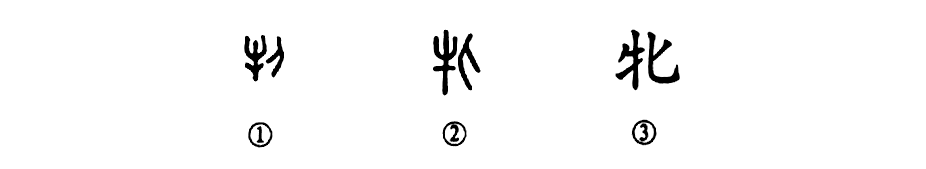這個“牝”(pìn聘)字是一個會意字。甲骨文①的左邊是個“牛”,右邊的“匕”是個雌性符號。從甲骨文的其它文字看,凡是表示母羊、母豬、母馬、母鹿的字都有這個雌性符號。②是小篆的形體,其左仍然是“牛”但是其右的雌性符號變得與甲骨文的雌性符號相反,像個反“刀”形。③是楷書的形體,是直接由小篆變來的。