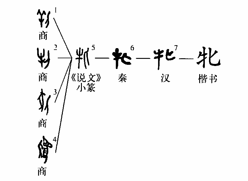 形聲字。從牛,匕聲。甲骨文中用以表示雌性家畜或獸類,或從牛,或從羊,或從豕,或從虎等,表示雌性之牛、羊、豕、虎等。牝本義指母牛。《乙編》 45.90:“翌乙巳?且(祖)乙