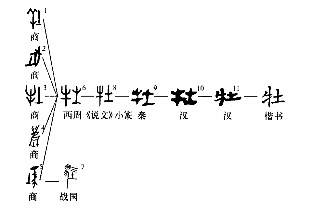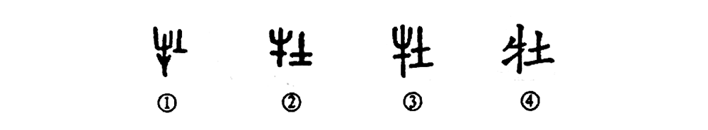 這個“牡”字也是個會意字。甲骨文①的左邊是“牛”,右邊是古文字中的一種雄性符號。從甲骨文的其它文字看,凡表示公羊、公豬、公馬、公鹿的字都有這種雄性符號。所以它們也都是會意字。金文②的左邊仍然是“牛”,右邊發生了偽變,把雄性符號錯變成“土”字了。這就由原來的會意字變成了左形(牛)右聲(土)的形聲字“牡”了。③是小篆的形體,與金文的形體完全一致。④是楷書的寫法。