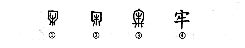 這個“亡羊而補牢”的“牢”字是個會意字。甲骨文①的外面像飼養牲畜的欄圈,其中間是“?!?,也就是把“?!标P在欄中之義。金文②的形體與甲骨文的形體基本一致。③是小篆的寫法,把牛關在欄中,在欄門上再橫上一塊大木頭,牛跑不出來,可謂牢固了。④是楷書的寫法,從“宀”從“?!碑斎蝗允且粋€會意字。