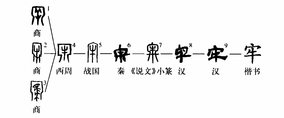 像圈欄之形。 《說文》小篆因秦簡寫法而誤增一筆,許慎遂以為從冬省,非是。睡虎地秦簡是處于隸變中的文字,它包含有篆體和隸體兩重因素,即篆、隸合一,李斯所制小篆即源于其篆體因素。睡簡和小篆時代相近,《漢語大字典》排列字形依時代先后均把睡簡文字置于《說文》小篆后,但從實際的文字形體演變角度考慮,不能如此拘泥,應依從文字形體發展的實際脈絡,或置于小篆后,或置于小篆前。本條置于小篆前,所謂從冬省便可做出一個合理的解釋?!袄巍弊直玖x指養牛、羊、馬等牲畜的圈欄。《說文》:“牢,閑,養牛馬圈也。”《詩·大雅·公劉》:“執豕于牢。”然甲骨文中不用本義,而是用其引申義,指關養于圈欄中之牛羊馬。古代祭祀,對于圈養之牛與非圈養之牛區分甚嚴。據卜辭所反映的情況,殷人稱普通的牛為“?!?,它們可能是普通牧放中的牛,也可能是臨時征收來的。而牢是經過特殊飼養的牛,作為祭牲,用“牢”要比用“牛”隆重。這種經過特殊飼養的牛,其大者謂之“大牢”,其小者謂之“小牢”,傳世文獻中稱牛羊豕各一為大牢,羊豕各一為少牢,原是秦漢以來的一種說法,并不符合殷商禮制。甲骨文中字或從羊作,亦或從馬,構意與牢同,其構形可與甲骨文之“牡”、“牝”等相參。由牢閑義引申出牢獄義。牢用來關養牲畜,為防止其逃跑,要修得牢固,因此又引申出牢固義。(陳英杰)