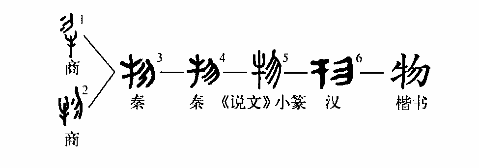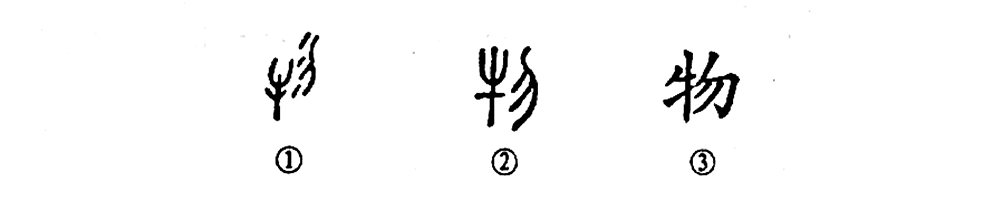 “人為萬物之靈。”這個“物”字本為會意兼形聲的字。①是甲骨文的形體,左為牛,右為勿。卜辭謂雜色牛為“物”。②為小篆的形體,與甲骨文相似。③是楷書的寫法。