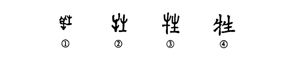 ”字的右邊是“生”,“生”的下部的一條橫線是表示地面,地面之上是長出的一棵草(或樹苗),這就表示生長之義。但是“生”在“姓”中僅表讀音。所以這個“牲”字是一個左形(羊)右聲(生)的形聲字。金文②把甲骨文左邊的“羊”換成了“牛”;牛的兩角向上彎,羊的兩角向下彎,這是“牛”和“羊”二字在甲骨文中的根本區別,這好像是一條規律。③是小篆的形體,是從金文直接演變而來。④是楷書的寫法。
