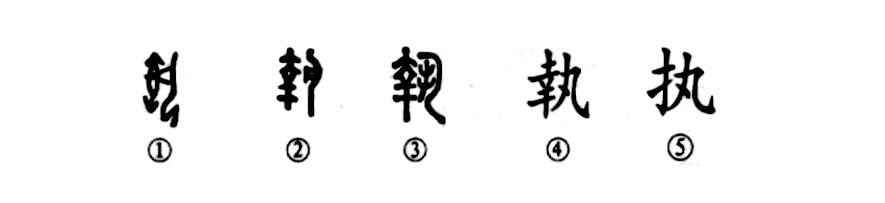 “官不過侍郎,位不過執(zhí)戟。”這個“執(zhí)”字本為會意字。①是甲骨文的形體,左邊是類似手銬一類的刑具,右邊是一個面朝左半跪著的人,雙手被手銬鎖住。②是金文的形體,與甲骨文相似。③是小篆的寫法,左邊的刑具和右邊的人都失去了原形。④為楷書的繁體字。⑤為簡化字。
