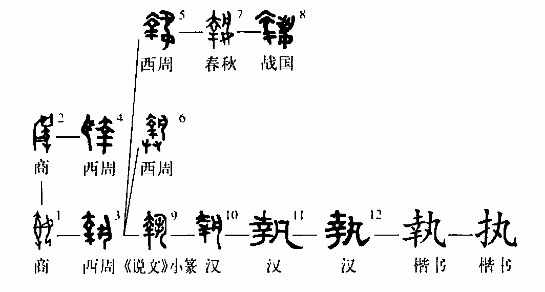 會意字。從丮(jǐ),像伸出雙手之人形;從?(幸,niè),像手銬之形;全字表示給伸出雙手之人戴上刑具。本義為拘捕。《說文》:“執(zhí),捕罪人也。”《詩·大雅·常武》:“鋪敦淮??(布陣靠近淮水邊),仍執(zhí)丑虜。”由拘捕義引申為持、拿,又引申為掌握、掌管、主持、控制、施行、堅持、固執(zhí)等義。“執(zhí)”又由“持、拿”引申為持、拿的東西,即憑單,如“回執(zhí)”、“收執(zhí)”。甲骨文像人(或朝左,或朝右)雙手戴刑具之形,或連頭頸一起使用刑具束縛。文例有“執(zhí)羌” (逮住了羌族的人)、“執(zhí)寇”(逮住了強盜)、“執(zhí)兕”(逮住了犀牛)等。金文字形漸趨訛斷或有加繁。文例中很多是“折首執(zhí)訊”,指在戰(zhàn)斗中斬掉敵人的首級,逮住敵人作俘虜。小篆成左“?”、右“丮”;隸楷文字由小篆演變而來,寫作“執(zhí)”。現(xiàn)代漢字簡化時,“執(zhí)”據(jù)草書簡作“執(zhí)”。(郭小武葉青)
