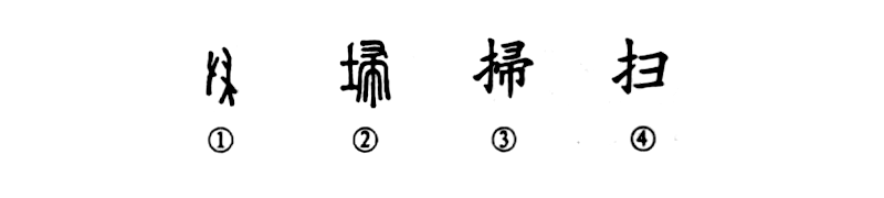 “掃蕩六合清,仍為負霜草。”這個“掃”字本為會意字。甲骨文①的右邊是一把掃把,左邊是一只手,表示掃除塵土。②是小篆的形體,掃把仍在右邊,左邊換成“土”,以帚掃土,仍為掃除意。③為楷書繁體字,又將“土”換成“手”,為以手持帚掃除之意。④為簡化字。