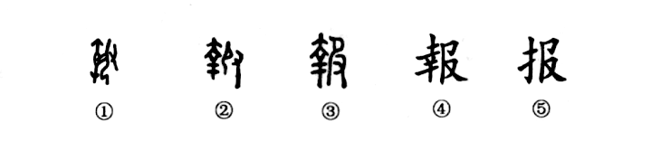“俏也不爭春,只把春來報。”這個“報”字本為會意字。甲骨文①的左邊是一種刑具,中間是面朝左跪著的一個人,人頭的后邊有一只大手,可見這就是表示押解一名罪人的意思。②是金文的形體,與甲骨文相似。③是小篆的寫法。④為楷書的繁體字。⑤為簡化字。