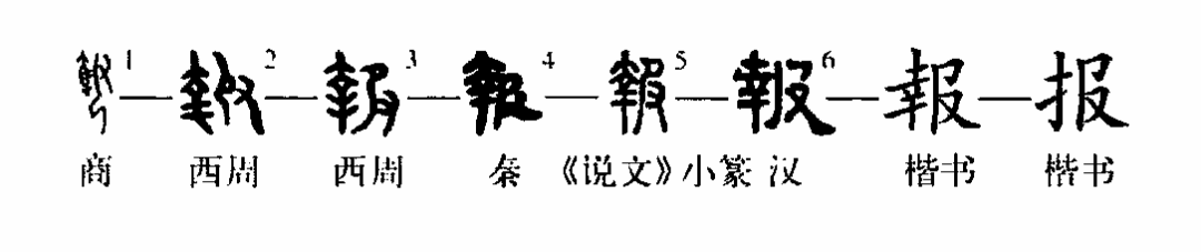 會意兼形聲字。從?(niè,手銬形),從??(fú,用手從后面將人制服), ??亦聲;表示制服犯人使之服罪。本義為制服、判決罪人,讀作bào。《說文》:“報,當罪人也。” “當”義為判決。《韓非子·五蠹》:“司寇行刑,君為之不舉樂;聞死刑之報,君為流涕。” (司寇官執行刑法時,君主為之停止奏樂;聽到死刑的判決,君主為之流下眼淚)判決罪人需上報,由此引申為報告,由報告又引申為告訴、回答、傳達、通知、報答、報復、報應等義,又用作名詞,指告訴或傳達信息的各種載體,如“電報”、“簡報”、“報刊”等。又讀作fù,通“赴”,義為急速,如古籍中有“報往”、“報來”。甲骨文字形有人釋為“執”字的繁構;但多數學者釋為“報”字。釋為“報”字可有兩種分析方式,其一是左邊為雙手戴著刑具跪地的人(即“執”字),右邊是按人的手;其二是從“幸” (niè)、從“??”, “??”亦聲。甲骨文另有“??”字,習見,指一種常被用為祭牲的罪奴。從形音義關系看, “報”、“??”本應是一字的繁簡兩種寫法,且可與“俘” “服” “伏”等的形音義相關聯。金文由甲骨文演變而來,但明顯是左“幸” (niè)、右“??”;以后字形變化不大。現代漢字簡化時,“報”據漢代草書簡作“報”。(郭小武 葉青)
