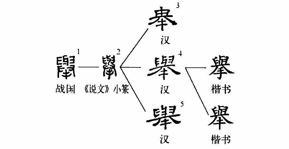 形聲字。從手,與聲。“舉”字始見于金文,從犬,與聲,義為舉薦。中山王壺:“舉賢使能。”小篆從手,本作擧。清邵瑛《說文群經正字》:“今經典作舉。隸變漢碑多如此作,今俗因之。”可見,隸變以后,舉的下部由“手”變為“