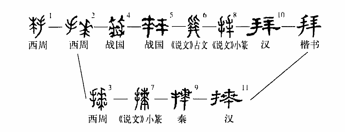 會意字。從手,從??。金文像手連根拔掉一種植物。小篆有繁簡二體:繁體從手、從??,簡體則從兩手形并置,從丅(下),表示下拜之意。隸書承襲小篆亦有繁簡二體。今均用簡體“拜”字。??,文獻多作“拜”,本義為拔。《詩·召南·甘棠》:“蔽芾甘棠,勿翦勿拜,召伯所說。”引申為提拔,授予官職。《史記·廉頗藺相如列傳》:“拜相如為上大夫。”進而引申為拜謝,拜訪。《論語·陽貨》:“孔子時其亡也,而往拜之。”《說文》:“??,首至地也。從手、??。??音忽。