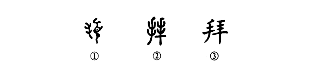“雙杯行酒六親喜,我家新婦宜拜堂。”這個“拜”字本為會意字。①是金文的形體,左為“手”,右為“頁”(很像面左而立的人形),“頁”即“頭”的形象。這就表示舉手至頭為拜。②是小篆的形體,為兩手之形,合掌為拜。③是楷書的寫法。