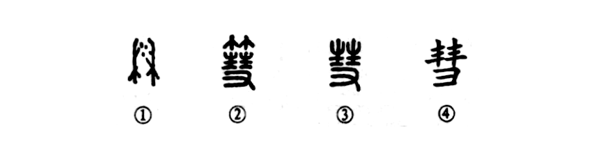 “昭王擁彗先驅(qū)。”這個(gè)“彗”字本為會意字。①是甲骨文的形體,像兩把掃帚,上部中間的三個(gè)點(diǎn)兒指灰塵??傮w表示以帚掃除塵灰。商承祚認(rèn)為:“下掃謂之掃,上掃謂之彗。”②是小篆異體字,其上增加“竹”,表示掃帚是用竹做成,中間是掃帚的訛變之形,下邊為一只手(又)。③是小篆的形體,上部無“竹”。④為楷書寫法。