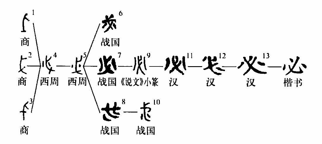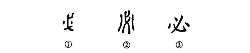 “物類之起,必有所始。”這個“必”字本為象形字。①是金文的形體。其上部的缺口處,可以捆綁斧頭,其下為彎曲的斧柄。②是小篆的形體,根本看不出斧柄的樣子了。③為楷書寫法。