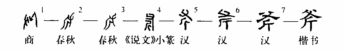 形聲字。《說文》:“斧,斫也。從斤,父聲。”斫指砍伐的意思。斧是用來砍伐樹木的工具,也用作砍伐人的刑具,用處很廣。斧字在商周墓葬中多有出土,與今天之斧基本相同。在甲骨文,斧字就已經變為形聲字,但是“斧”字所從的“父”聲旁本是石斧的象形字,本作,象手持石斧,這種石斧原始社會墓葬多有出土。據此可知,父即斧字初文,因為用為父親之父,因此加“斤”旁而成為從斤父聲的形聲字。(周寶宏)