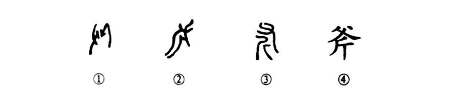 “林木茂而斧斤至焉。”這個“斧”字本為形聲字。①是甲骨文的形體。右邊是“斤(斧頭)”,表形;左為“父”,表聲。②是金文的形體。③是小篆的形體,變為上聲下形的形聲字。④為楷書的寫法。