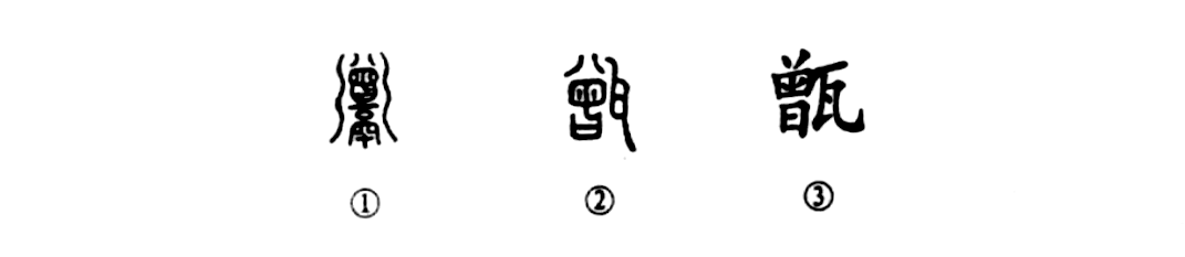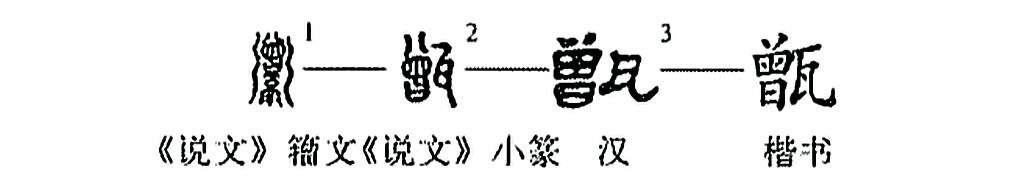 “長碓搗珠照地光,大甑炊玉連村香。”這個“甑”字讀作zèng,是個會意兼形聲字。①是《說文》中籀文的形體,中間的下部是“鬲(lì,炊具)”,兩側的曲線是烹煮時所散發的蒸汽,中間的上部是“曾”,表示該字的讀音。②是小篆的形體,其右邊是“瓦”,表示“甑”有陶制的,這就變成了右形左聲的形聲字。③是楷書的形體。
