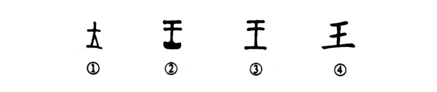 “帝王將相寧有種乎!”這個(gè)“王”字是個(gè)象形字。甲骨文①是個(gè)斧頭之形,下端是斧刃。金文②也基本上同于甲骨文的形體,不過下端的斧刃更像實(shí)物,如同古代武士所拿的大板斧。小篆③的形體是由全文演變而來。④是楷書的寫法。