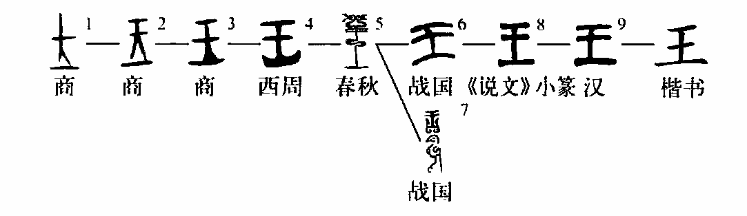 ”演變)。以斧鉞象征王權(quán)。本義是指古代最高統(tǒng)治者。《說文》:“王,天下所歸往也。”《爾雅·釋詁上》:“王,君也。”《禮記·內(nèi)則》:“后王命冢宰,降德于眾兆民。”陸德明釋文:“王,天子也。”這種意思的“王”今天讀wáng。“王”字引申之又有統(tǒng)治之意。《詩·大雅·皇矣》:“王此大邦,克順克比。”《史記·項(xiàng)羽本紀(jì)》:“先破秦入咸陽者王之。”即其例。這種意義的“王”今天讀wàng。甲骨文早期“王”字作“