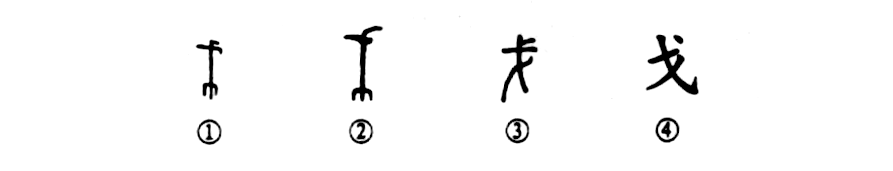 這是“躍馬橫戈”的“戈”字。甲骨文①就是“戈”的象形字。金文②的上部是“戈”的鋒利的“刃”,下部是“戈”的長柄,也是像“戈”的樣子。可是小篆③就不像了。④是楷書的形體。
