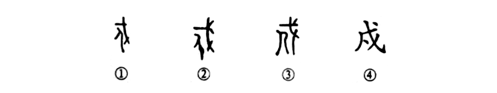 這是“從軍昔戍南山邊”的“戍”字,是個(gè)會意字。甲骨文①的左下部是個(gè)“人”,面部朝左而側(cè)立。右上方是“戈”(武器),“人”在“戈”旁,就是“守衛(wèi)”的意思。②是金文的形體,與甲骨文極為相似。③是小篆的寫法,也是從甲骨文演變過來的。④是楷書的形體,戈的左下方是人。