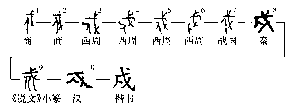 會意字。甲骨文“戍”字從人在戈下,會戍守之意。金文承襲甲骨文,所從的“人”旁豎筆上或加點(diǎn)為飾。秦簡“戍”字所從的“人”旁上部或與“戈”所從的橫畫相交,遂為隸楷所本。本義是防守邊疆。《說文》:“戍,守邊也。”錄卣:“女(汝)其以成周師氏戍于□??。”《詩·王風(fēng)·揚(yáng)之水》:“不與我戍申。”毛傳:“戍,守也。”引申指戍守部隊(duì)。甲骨文多用此義。《京都大學(xué)人文科學(xué)研究所藏甲骨文字》2142:“其乎戍御羌方。”(命令戍守部隊(duì)抵御羌方)(徐在國)