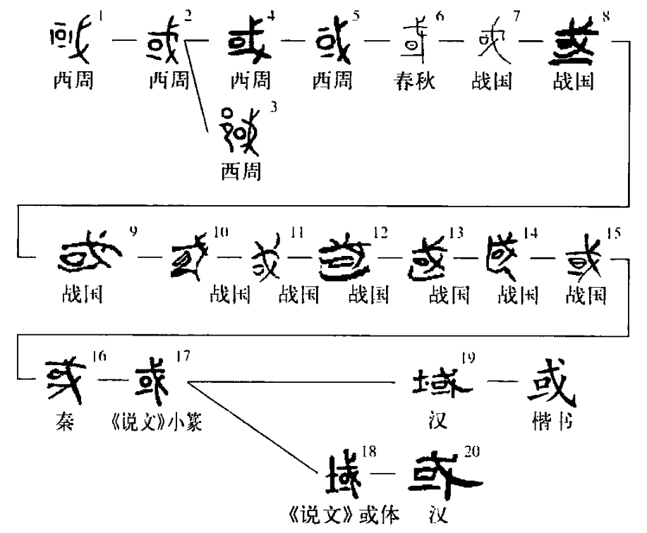 會意字。從戈、從口,口像城形,會用戈守城之意。國之初文。西周金文“或”字或從口,從柲之初文。所從的“口”(城之初文)多是上、下加短橫以圍之,有的是上、下、左、右均加短橫以圍之,或“口”內加點為飾,還有贅加“邑”旁繁化的。春秋、戰國文字“或”承襲西周金文,或上、左、下短橫相連作“匚”形,遂分化出“國”字。《說文》或字異體作“域”,加“土”繁化。后分化出“域”字。本義是邦國、封國。《說文》:“或,邦也。”何尊:“余其宅茲中或。”師?簋:“弗跡我東或。”又指邊境、疆界。毛公鼎:“康能四或(域)。”《詩·商頌·玄鳥》:“肇域彼四海。”朱熹集傳:“域,封境也。”這些意義的“或”讀為yù。《包山楚簡》120:“或殺下蔡人舒睪”(有人殺了下蔡人舒睪),“或”,代詞,相當于“有人”。《廣雅·釋詁一》:“或,有也。”齊镈:“勿或俞(渝)改。”(不要有所改變)清王引之《經傳釋詞》:“或,猶又也。”??匜:“白(伯)揚父乃或(又)吏(使)牧牛誓曰。”這些意義的“或”讀為huò。(徐在國)