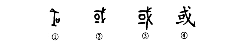 “或遲或速,或先或后。”這個“或”字是個會意字。①是甲骨文的形體,左邊是“戈”,中間的“口”表示城有墻垣,并有武器守衛,所以“或”字的本義就是“國家”的“國”。②是金文的形體,較甲骨文復雜了些,但字意未變。③是小篆的形體。④是楷書的形體,均從金文直接演變而來。