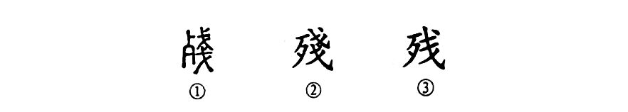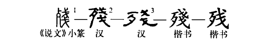 “短衣匹馬隨李廣,看射猛虎終殘年。”這個“殘”字本為會意兼形聲的字。①是小篆的形體,左為“歹(殘骨形)”,右為“戔”,是相重疊的兩把“戈”,表示殘殺之意,亦表聲。②是楷書繁體字。③為簡化字。