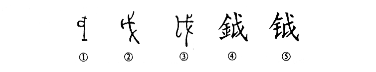 “戉”是“斧鉞”之“鉞”的本字,讀作yuè。甲骨文①就像商、周青銅兵器的形狀,上部朝左的部分是“鉞刃”(似斧頭),下部是長(zhǎng)柄,可見“戉”是個(gè)象形字。②是金文的形體,與甲骨文相似。③是小篆的形體,已經(jīng)看不出“鉞”的模樣了。④是楷書,左邊又增加了形符“金”,成為左形右聲的形聲字了。⑤是簡(jiǎn)化字。