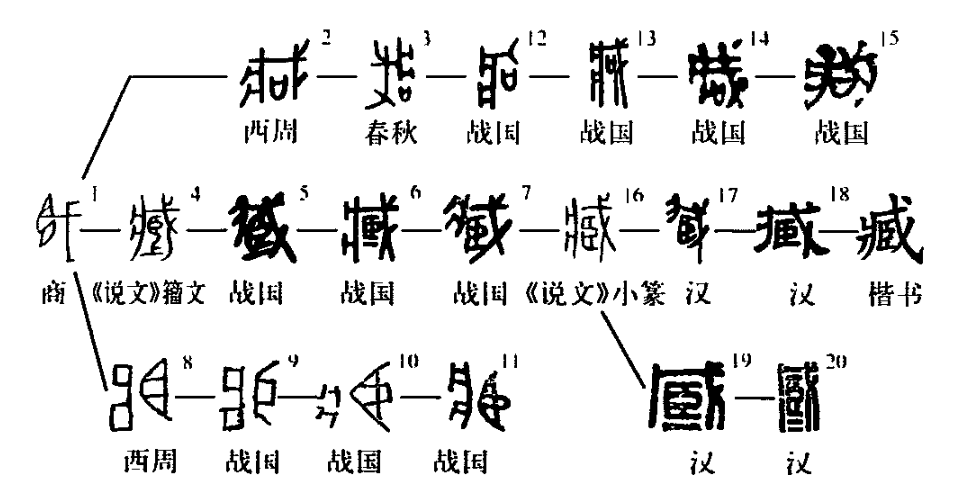 初為會意字。甲骨文從戈刺目,戈為兵器之象,豎目為仆隸之象,二者結合會臧獲(對奴婢的賤稱)、隸人意。“”雖是最早出現的臧字,但不是最具代表性、后來成為主流寫法的臧字。爿(chuáng)當是臧字的遠源、初文、聲首,它在甲骨文中也已出現,是床的象形字。后來它與形旁戈結合成為從戈爿聲的形聲字戕,是最早的臧字。其之所以從戈,蓋源于臧獲多為戰俘。其字雖見于春秋,實際出現應早得多,西周時有從口戕聲的臧字出現(加口蓋取意于隨意指令),可以證明戕在西周甚至更早的時段內存在。戕字應出現在