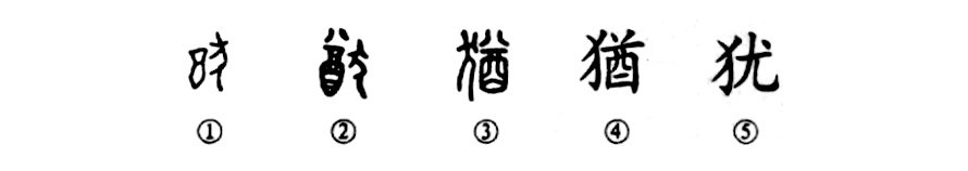 甲骨文①的右邊是一條頭朝上背朝右的狗,左邊是盈尊的酒器之形,既表意也表音。