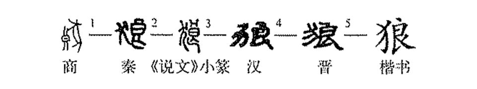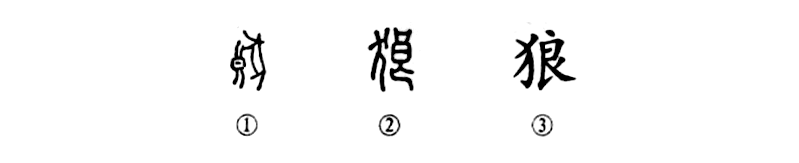 “是乃狼也,其可畜乎?”這個“狼”字本為形聲字。①是甲骨文,左邊的 “良”字表音;右邊為頭朝上的“狼”形。②是小篆的形體,因“狼”似 “狗”,所以左邊變?yōu)?ldquo;犬”,右邊仍為“良”。③是楷書的寫法。