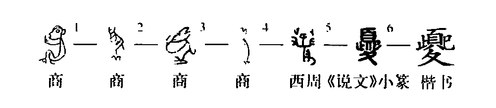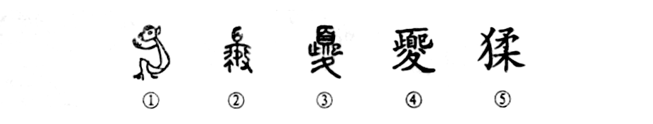 ②是金文的形體,變得不像了。③是小篆的寫法。④為楷書的寫法。⑤為后世通行楷書體,變象形為形聲。