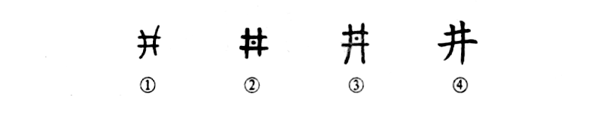 “吃水不忘打井人。”自古以來,“井”與人民的生活緊密相聯。甲骨文①就像一個方口水井。金文②在井的中心加了一個點兒,表示這是水的所在,所以“井”字是個指事字。③是小篆的形體,與金文相同。楷書④則把其中的點兒去掉,為了書寫方便。