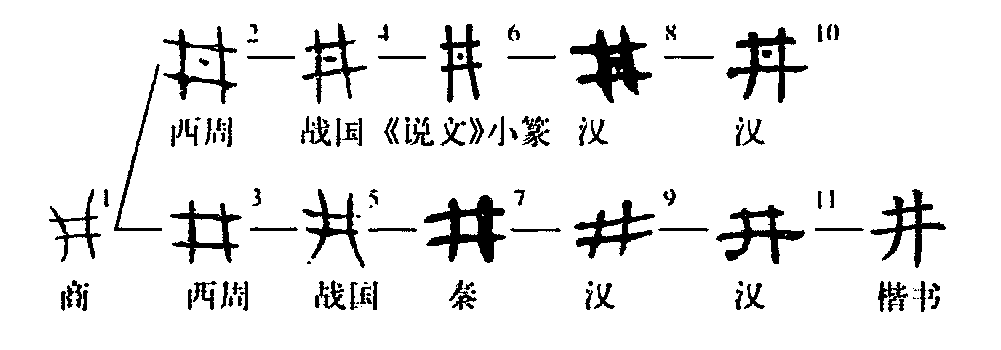 ”(改建城邑而不改水井)詞義縮小,就僅指井欄。井欄不能隨意越過,因此引申為法度、法則、懲罰,這些意義在周金文多有用例,而在典籍則寫作“刑”或“型”。“井”由本義比喻引申,可指類似井的建筑,如鹽井、礦井、天井等。先秦用“井”字字形描述一種土地制度——井田制:把一里見方的土地劃分成如“井”字形的九塊,每塊百畝,八家各分一塊,中間一塊為公田,所以