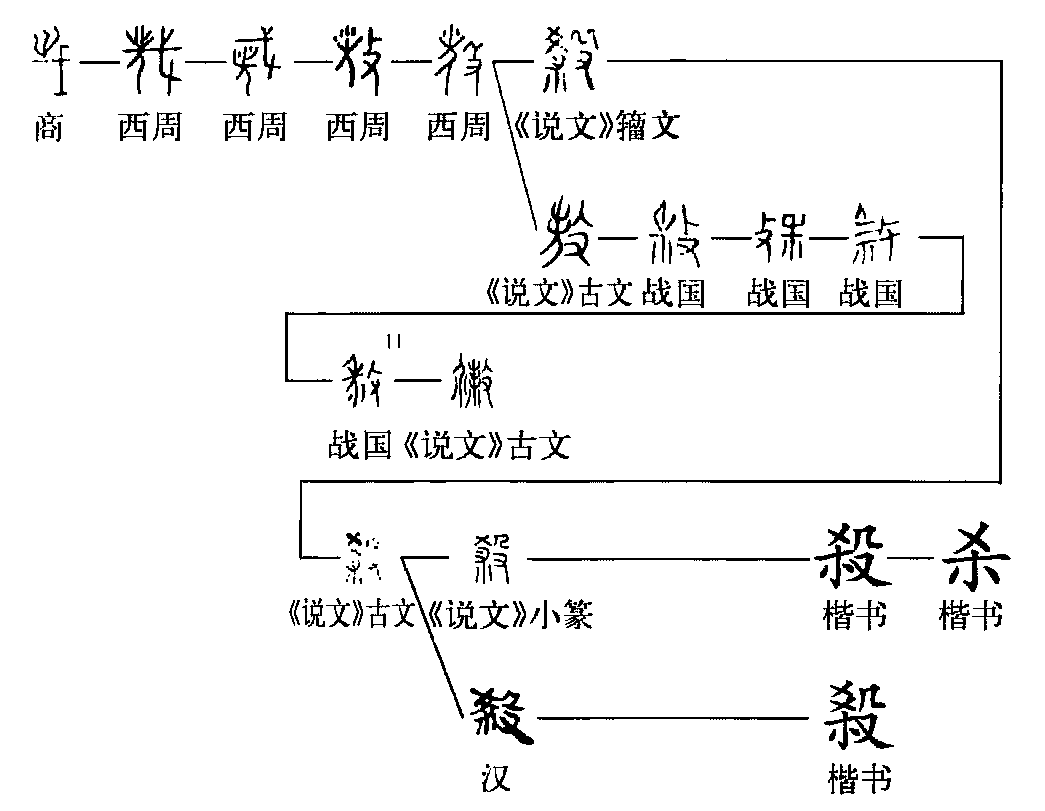 ,基本上同于籀文。《說文》小篆承襲了秦文字的主流結(jié)構(gòu),隸變后楷書作殺,簡化字作殺。承襲籀文的,楷書作毅,罕用。漢碑中或作